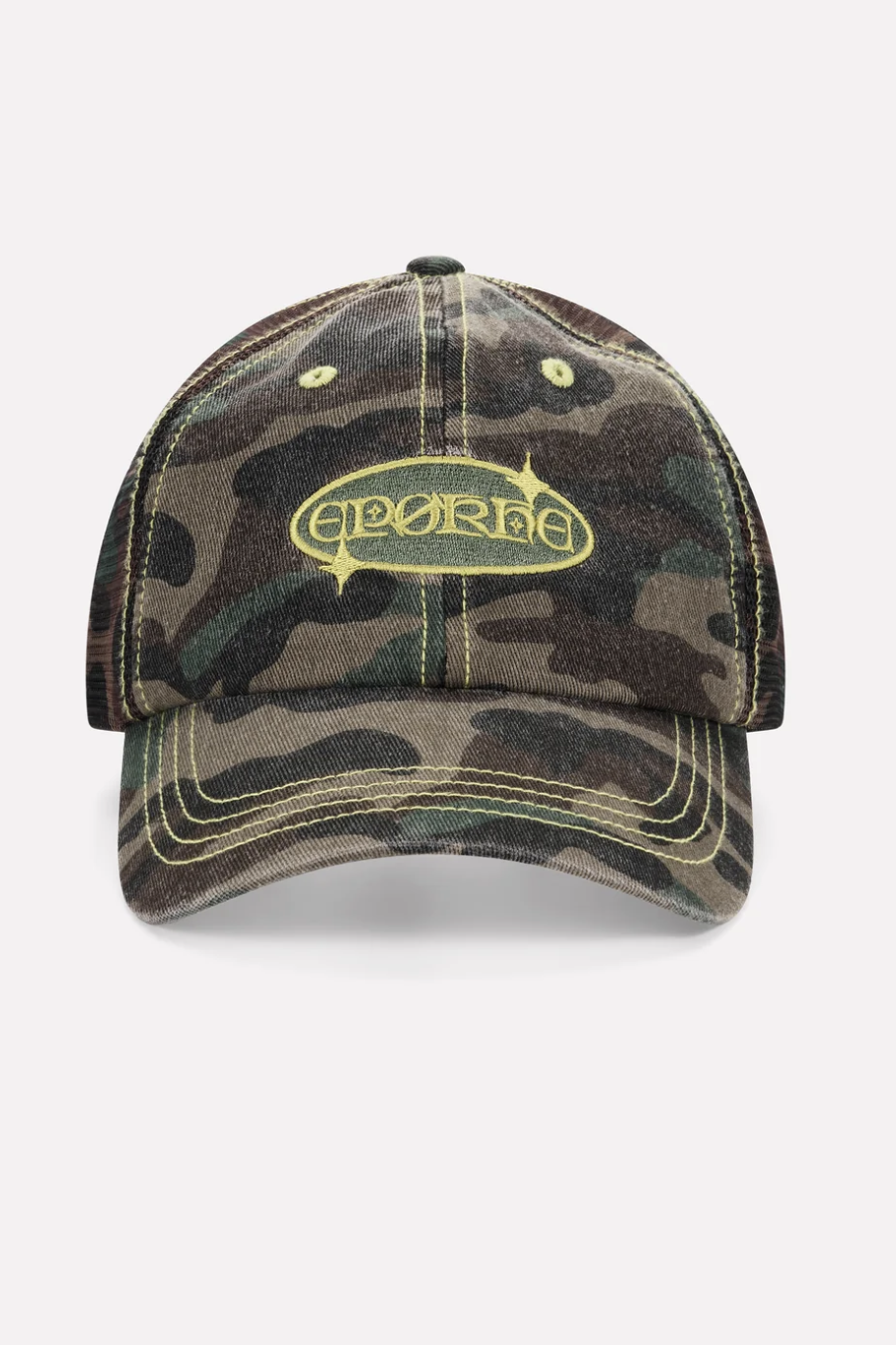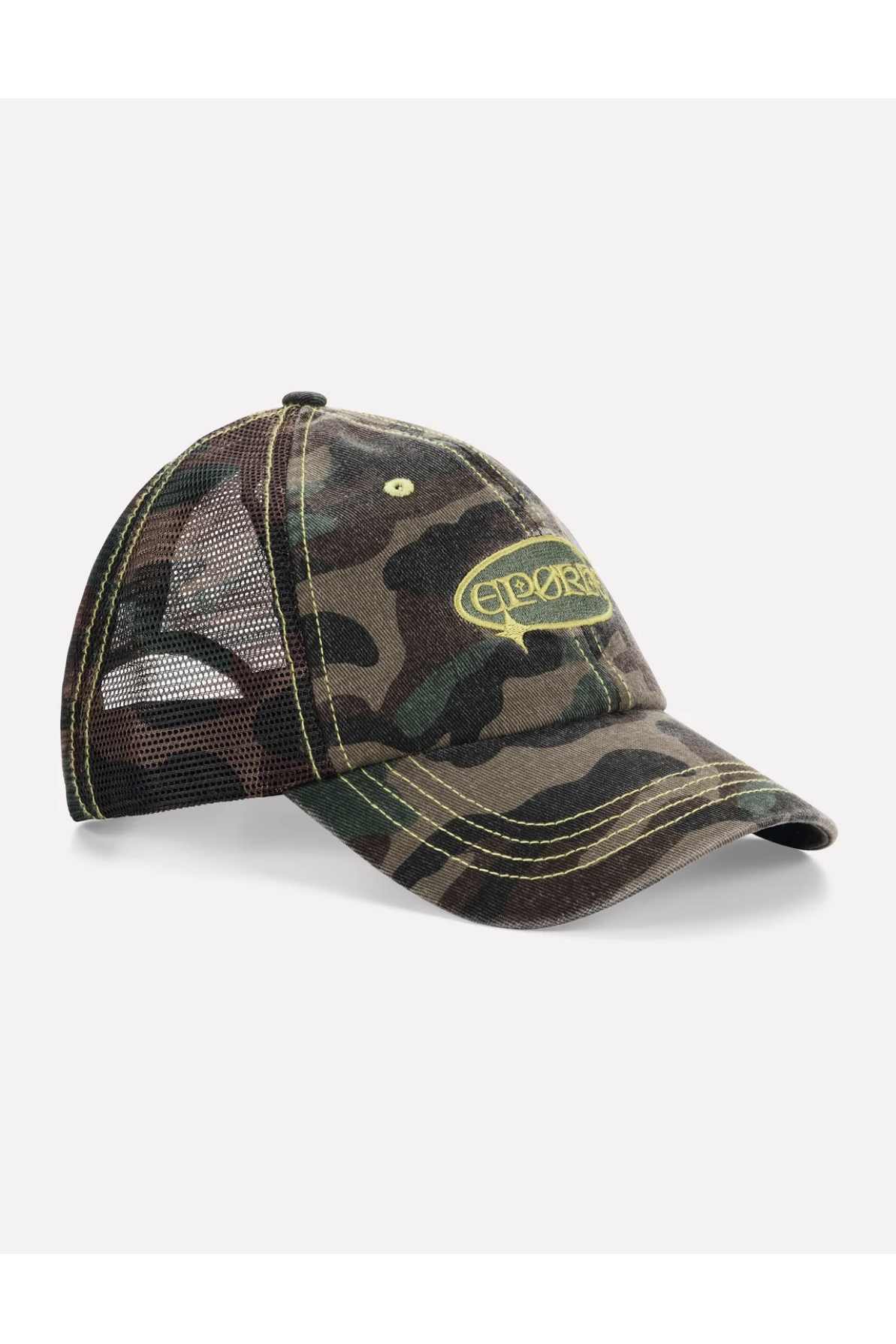 The Epokhe Folklore Trucker Hat in Classic Camo features bold yellow artwork over a cotton twill front. Finished with contrast stitching and breathable camo mesh backing.