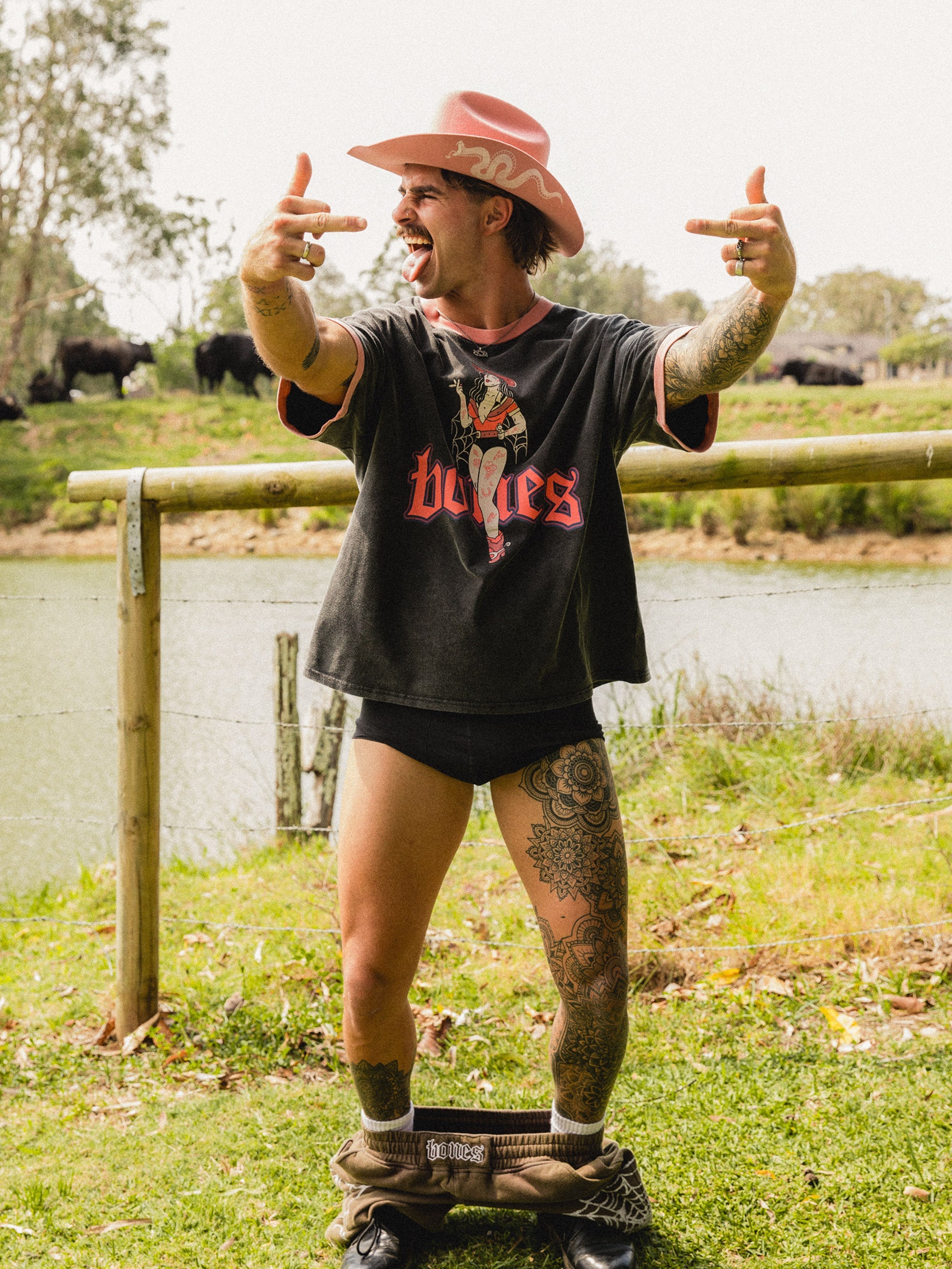 A new spin on our bestselling ringer tee! With light pink contrast cuffs and neck ribbing. Featuring our Neon Cowgirl Bones graphic on the front. Wrangle up a Neon Cowgirl Ringer Tee and complete that cowboy fantasy Club!