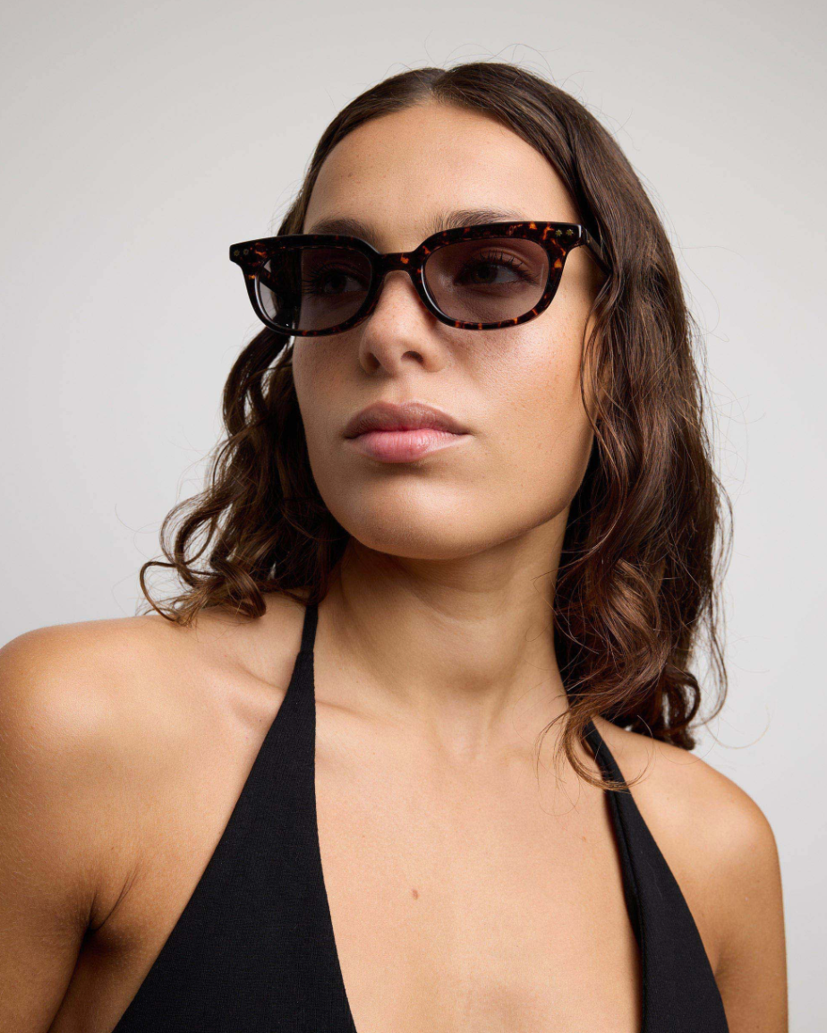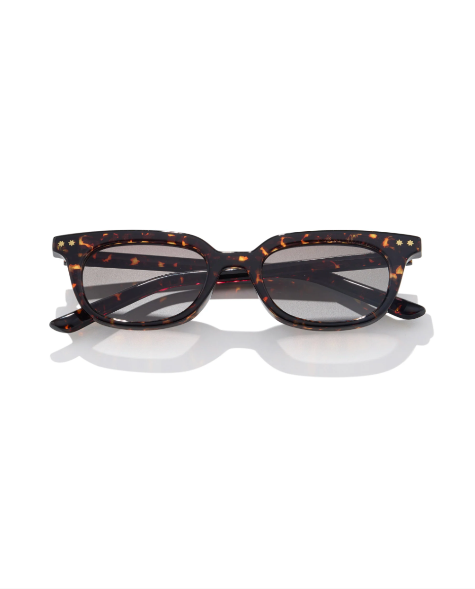 signature szade ; meet bates, a small, slick rectangular frame with sharp edges and clean lines. this dark tortoiseshell sunglass with gradient brown lenses takes design cues from the classic wayfarer but with completely modernised proportions. bates is an essential square-rectangle everyday frame to elevate any outift and is flattering to all face shapes.