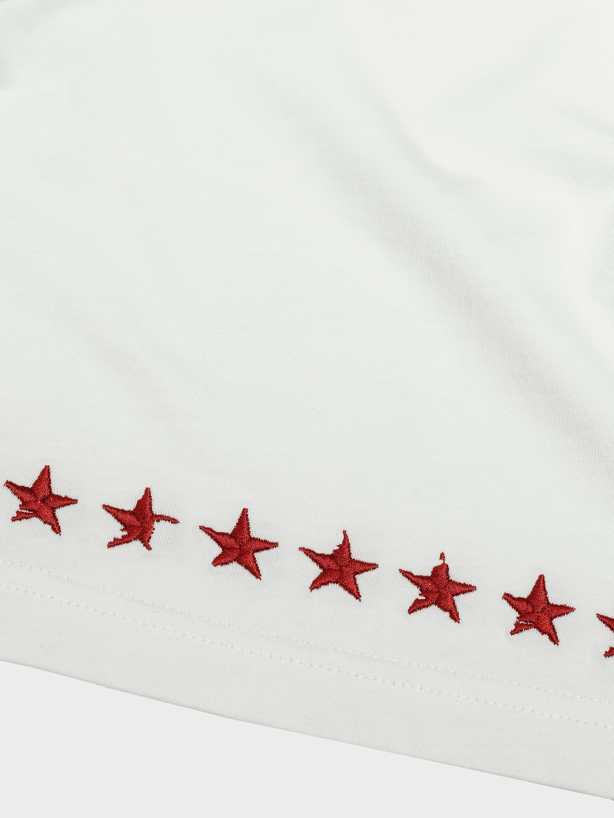 A new spin on our bestselling ringer tee! With red contrast cuffs and neck ribbing and red paneling on the shoulders. Topped with embroidered stars on the sleeves. Wrangle up a Country Club Ringer Tee and complete that cowboy fantasy Club!