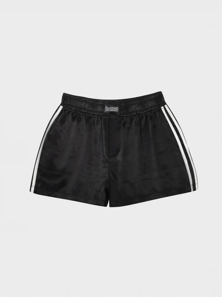These Double Crossed Black Silk Shorts have a high-shine finish, featuring sporty white side stripes and an elastic waistband featuring embroidered boxer 'Bones' on the front. These will be a staple for your summer outfit rotation, super comfy, super bad ass.