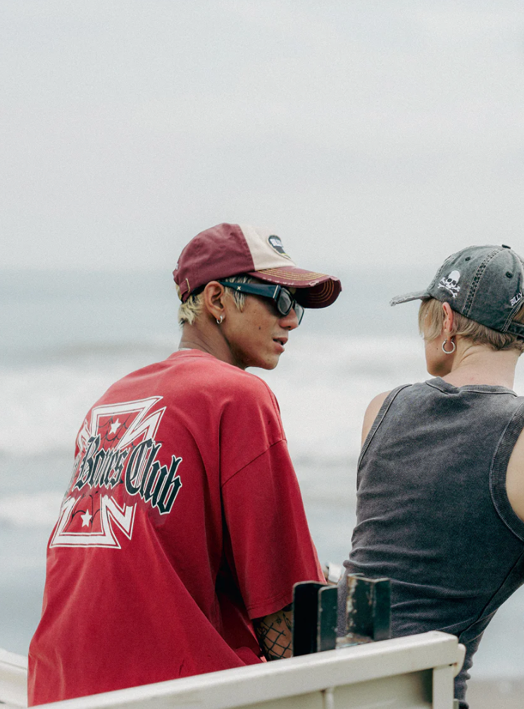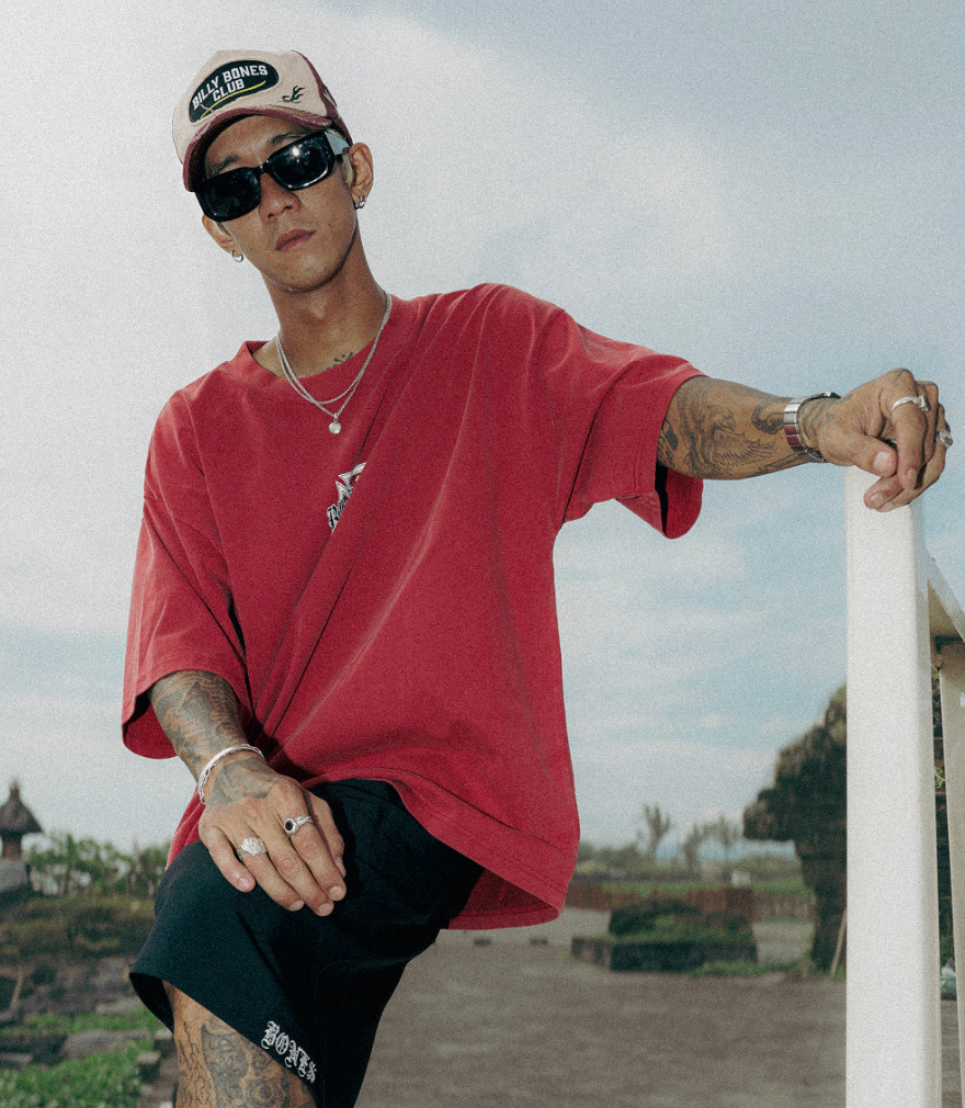 The Low Rider tee, made from 100% cotton in a box fit. Front and back graphics in a washed red.