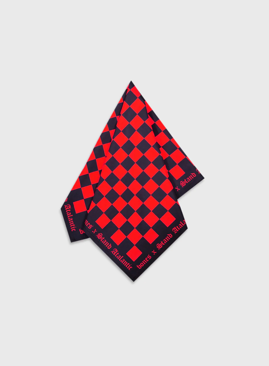 The official Bones Bandanna for the collab. It features all a collab crossover design over a check pattern.
